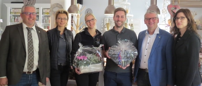 Bildinformation: Bürgermeister Albert Jung, Stadtbürgermeister Gerhard Weber und Wirtschaftsförderin Anna Löhr freuen sich über die Ansiedlung von „Mayfield Living“ und gratulieren dem Ehepaar Saßmannshausen herzlich zur Eröffnung. Foto: VG Kaisersesch