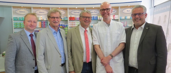 Bildinformation: V. l. n. r.: Tobias Wältermann (ARGE Kaisersescher Gewerbetreibender), Siegfried Niederelz (ARGE Kaisersescher Gewerbetreibender), Stadtbürgermeister Gerhard Weber, Pharmazierat Thomas Hanhart, Bürgermeister Albert Jung. Foto: Anna Löhr, VG Kaiseresch
