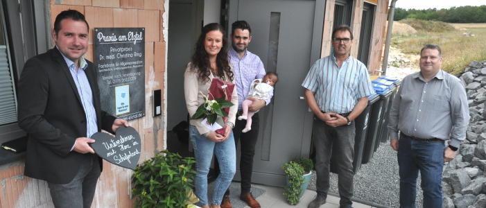 MdL Benedikt Oster, in Vertretung für Bürgermeister Albert Jung, Ortsbürgermeister Gerhard Mieden sowie Wirtschaftsförderer Mario Leidens wünschen Frau Dr. Christina Ring mit ihrer Praxis am Elztal viel Erfolg.