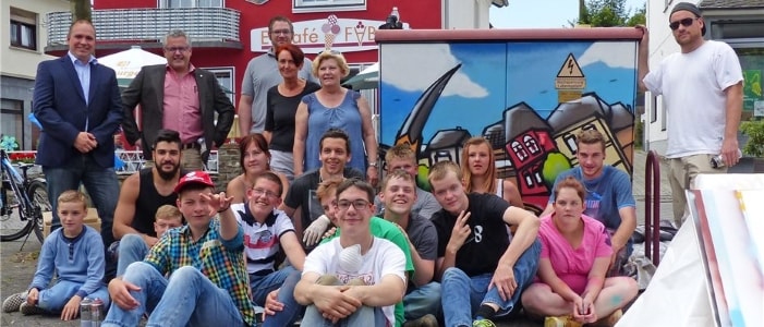 Graffitikunstverziert Stromstationen. Städtische Motive in bunten leuchtenden Farben verschönern die Trafo-Station am „Alten Postplatz“. Von dem Ergebnis überzeugten sich: RWE-Kommunalbetreuer Thomas Hau, Verbandsbürgermeister Albert Jung, Florian Schick, 1. Beigeordneter der Stadt Kaisersesch (v.l.) Anja Schindler, Leiterin der Jugendkunstschule (Jukusch) Cochem-Zell und Vertreter der Förderschule St. Martin Düngenheim
