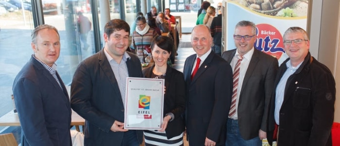 Zur Eröffnung der Filiale in Kaisersesch tritt die Bäckerei Lutz der Regionalmarke Eifel bei. Dies feiern Jost Geske von der Ellmühle in Köln, Michael und Sarah Lutz, Markus Pfeifer sowie die Kaisersescher Bürgermeister Albert Jung und Gerhard Weber.
