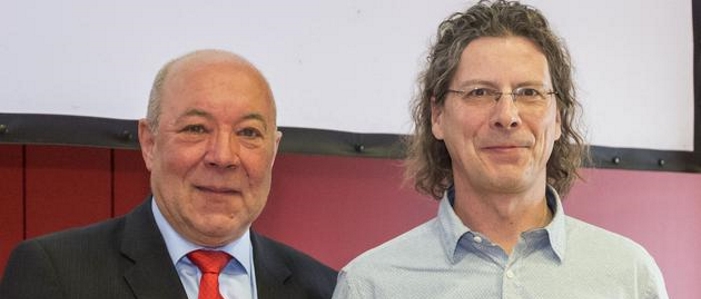 Bildinformation: Andreas Heinrich (rechts) von der Realschule plus und FOS Kaisersesch bekam von Magnus Schneider, Vorstandsvorsitzender der Lotto-Stiftung, einen zweiten Preis des "Inklusionspreises Musik Rheinland-Pfalz" in Höhe von 600 Euro verliehen. Foto: privat